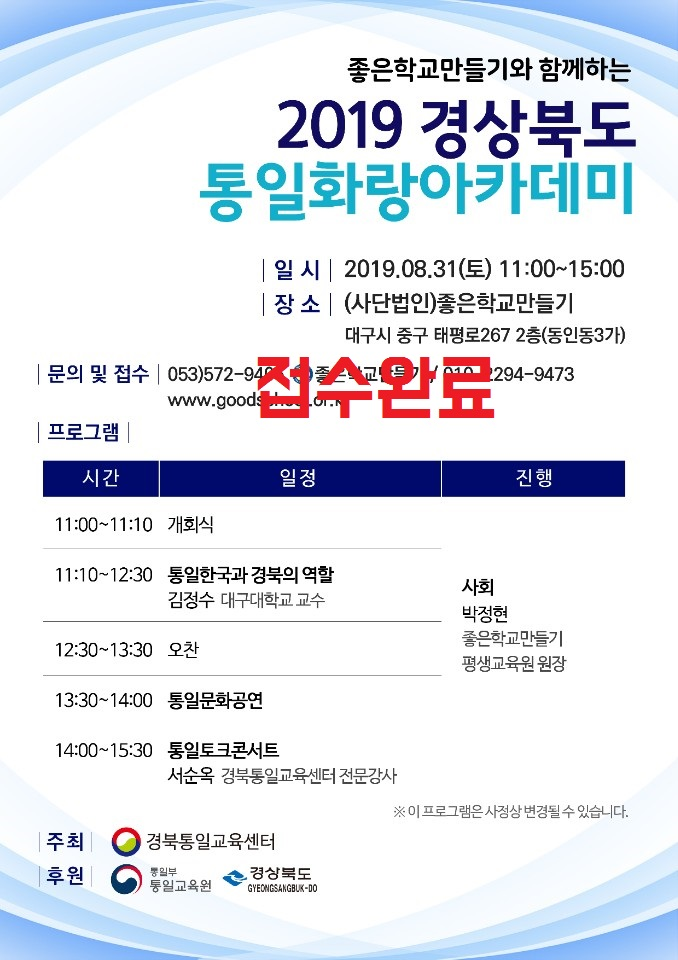 ÁÁÀºÇб³¸¸µé±â¿Í ÇÔ²²ÇÏ´Â 2019ÅëÀÏȶû¾ÆÄ«µ¥¹Ì ÅëÀÏÇѱ¹°ú ¿ì¸®ÀÇ ¿ªÇÒÀ̶ó´Â ÁÖÁ¦·Î ÁÁÀºÇб³¸¸µé±â¿Í °æºÏÅëÀϱ³À°¼¾ÅͰ¡ ÇÔ²²ÇÏ´Â ÅëÀÏȶû¾ÆÄ«µ¥¹Ì¿¡ ¸¹Àº Âü¿© ¹Ù¶ø´Ï´Ù. ¡àÀϽÃ:2019.8.31.(Åä)11:00~ ¡àÀå¼Ò:ÁÁÀºÇб³¸¸µé±â ºÎ¼³ Æò»ý±³À°¿ø (´ë±¸½Ã Áß±¸ ÅÂÆò·Î267, 2Ãþ(µ¿Àε¿3°¡ 271-152)) ¡à½Åû ¹× ¹®ÀÇ:053-572-9405 ¡áºÀ»ç½Ã°£À» ºÎ¿©¹Þ°íÀÚ ÇϽôºеéÀº 1365 ÀÚ¿øºÀ»çÆ÷ÅÐ ¿¡ °¡ÀÔ ÈÄ ½ÅÃ»ÇØÁֽñ⠹ٶø´Ï´Ù (https://www.1365.go.kr/vols/main.do) ¡áÁ¡½É½Ä»ç Á¦°ø ¹× Âü¼®ÀÚ Àü¿ø¿¡°Ô ¼ÒÁ¤ÀÇ ±â³äǰÀ» µå¸³´Ï´Ù. (¸Ó±×ÄÅ, Çìµå¼Â, ÈÞ´ëÆù¿ë ¿µ¾îÇнÀÇÁ·Î±×·¥µî) »ç´Ü¹ýÀÎ ÁÁÀºÇб³¸¸µé±â http:www.goodschool.or.kr